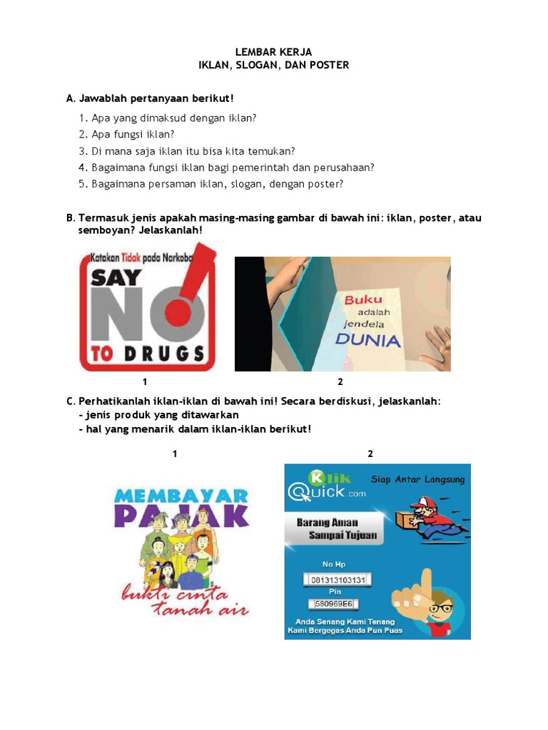 5 Soal Ini Dari Gambar Diatas Ya1 Identifikasilah Mana Yang Termasuk Iklan Slogan Dan Poster Brainly Co Id