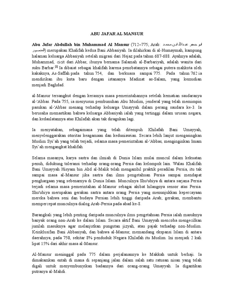 For more information and source see on this link. Abu Jafar Abdullah bin Muhammad Al Mansur 714775. Ia dilahirkan di al-Humaymah kampung halaman kelurga abbasiyah setelah bermigrasi dari Hijaz pada tahun 687-688.