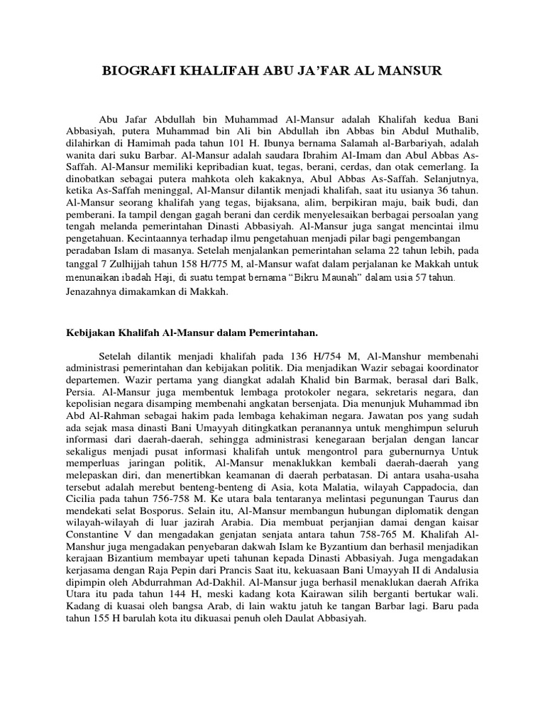 Ibunya bernama Salamah al-Barbariyah adalah wanita dari suku Barbar. Al-Mansur adalah saudara Ibrahim al-Imam dan Abul Abbas al-Saffah. Biografi Abu Jafar Al Manshur Abu Jafar Al Mansur Khalifah Abu Jafar al-Mansur 101-158 H732-775 M adalah putera Muhammad bin Ali bin Abdullah ibn Abbas bin Abdul Muthalib dilahirkan di Hamimah pada tahun 101 H.