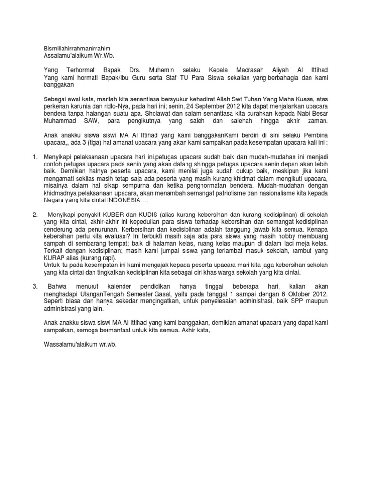 Para Siswa sekalian yang. Amanat pembina upacara sebelum menyampaikan amanat atau pesan kepada siswa sdsmpsmasmk pembina biasanya membutuhkan referensi contoh teks pembina upacara tentang tema menarik yang ingin disampaikan.