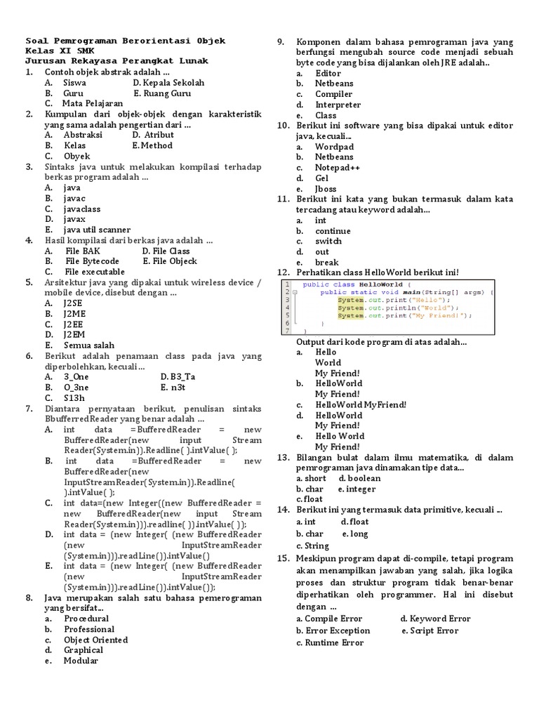 Artikel ini lanjutan dari soal dan jawaban pemrograman berorientasi objek PBO contoh soal dengan lengkap dan benar. Contoh Soal Esay Java. SOAL UAS SMK KELAS X Thn.