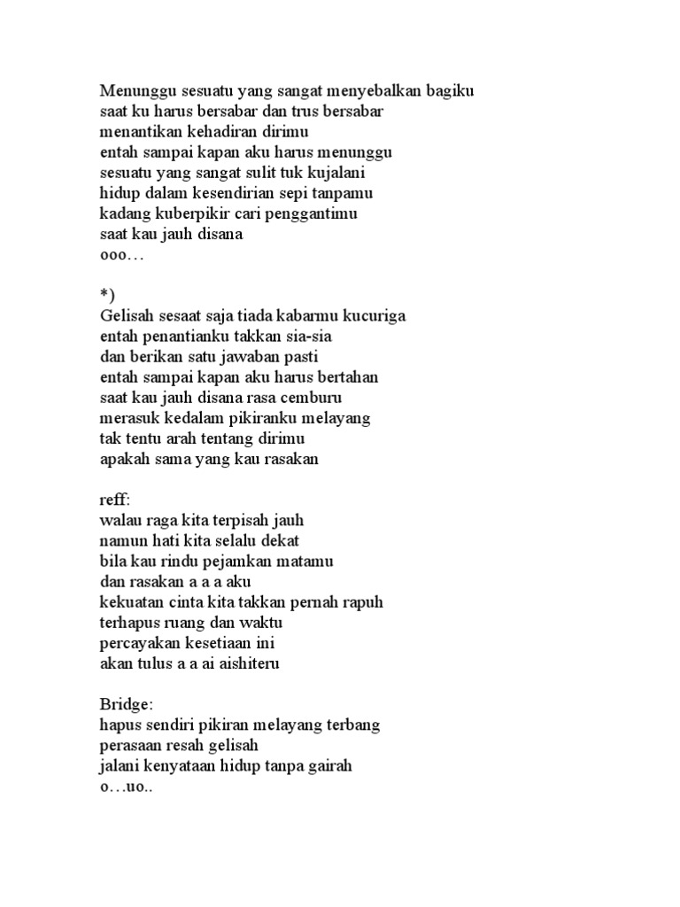 C menunggu sesuatu yang sangat G menyebalkan bagiku Am saat ku harus bersabar dan trus bersabar Em menantikan kehadiran dirimu C. Maaf jika video saya buat kurang menarik bagi kalian semua karna saya ju. Walau Raga Kita Terpisah Jauh Namun Hati Selalu Dekat.