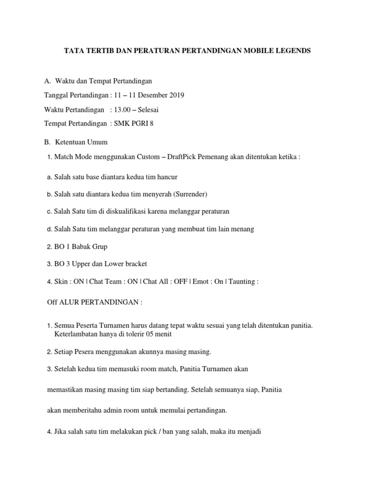 12 Semua Pemain wajib mengikuti semua aturan yang telah ditetapkan oleh Panitia Pengarah. 7 - 8 November 2020. Ada beberapa cara yang bisa kamu lakukan untuk membuat acara turnamen Mobile Legends yang seru.