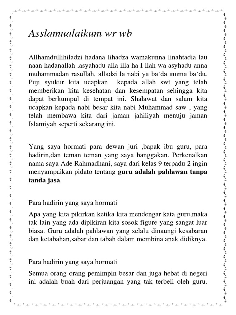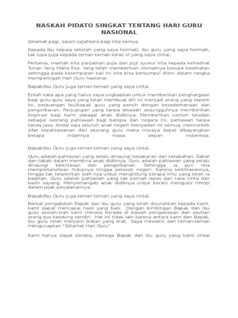 Mereka telah mendidik anak-anak calon penerus bangsa ini. Pidato Tentang Guru Pahlawan Tanpa Tanda Jasa. Pahlawan Tanpa Tanda Jasa Pidato Guru pidato GURU SEBAGAI SOSOK PAHLAWANdocx DOC Pidato upacara Yoga Nurohman - Academiaedu Buatkan pidato tentang hari guru secara singkat.