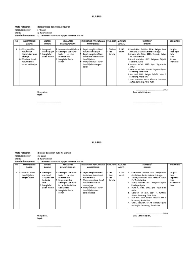 BACA TULIS AL-QURAN BTQ KELAS SEMESTER. Rpp kelas 1 btq baca tulis alqur an rencana pelaksanaan pembelajaran rpp. SILABUS MULOK BACA TULIS AL-QURAN.