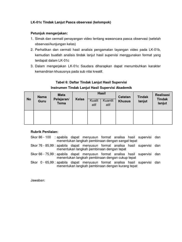Simpan Format Laporan Tindak Lanjut Hasil Supervisidocx Untuk Nanti. Melaksanakan tindak lanjut dengan memberikan arahan atau kegiatan atau tugas sebagai bagian remidipengayaan Jumlah pernyataan Ya untuk penilaian indikator kinerja Nilai indikator kinerja guru total pernyataan YAtotal indikator penilaian kinerja x 100. Dalam mengatasi permasalahan di atas Kepala Sekolah sebagai supervisor sekolah perlu melakukan tindakan sebagai berikut.
